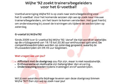 Wijhe ’92 zoekt trainers/begeleiders voor het G-voetbal!