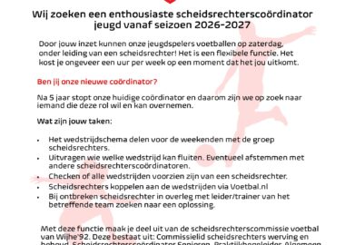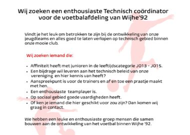 Vacature Technisch coördinator JO13-JO15 ‘Samen bouwen aan de ontwikkeling van het voetbal binnen Wijhe ’92‘...