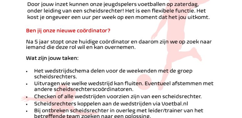 AlgemeenClubnieuwsVacaturesVoetbalVacature Scheidsrechterscoördinator Jeugd vanaf seizoen 2026-202712/03/20262Ben jij onze nieuwe coördinator Jeugd? Door jouw inzet kunnen onze jeugdspelers voetballen op zaterdag, onder leiding van een scheidsrechter!