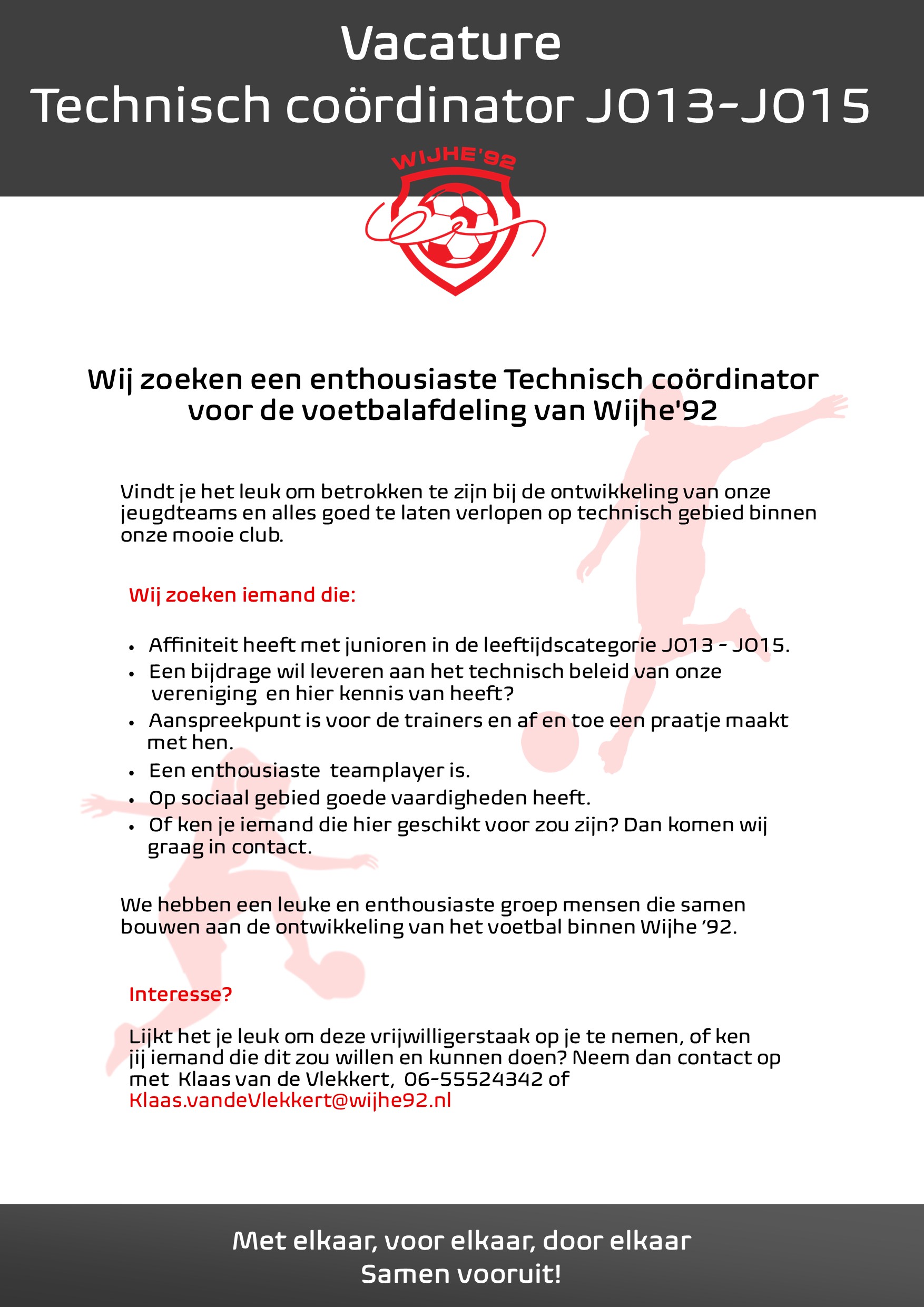 AlgemeenClubnieuwsVacaturesVoetbalVacature Technisch coördinator van de JO13 – JO1504/03/20261Vacature Technisch coördinator JO13-JO15‘Samen bouwen aan de ontwikkeling van het voetbal binnen Wijhe ’92‘